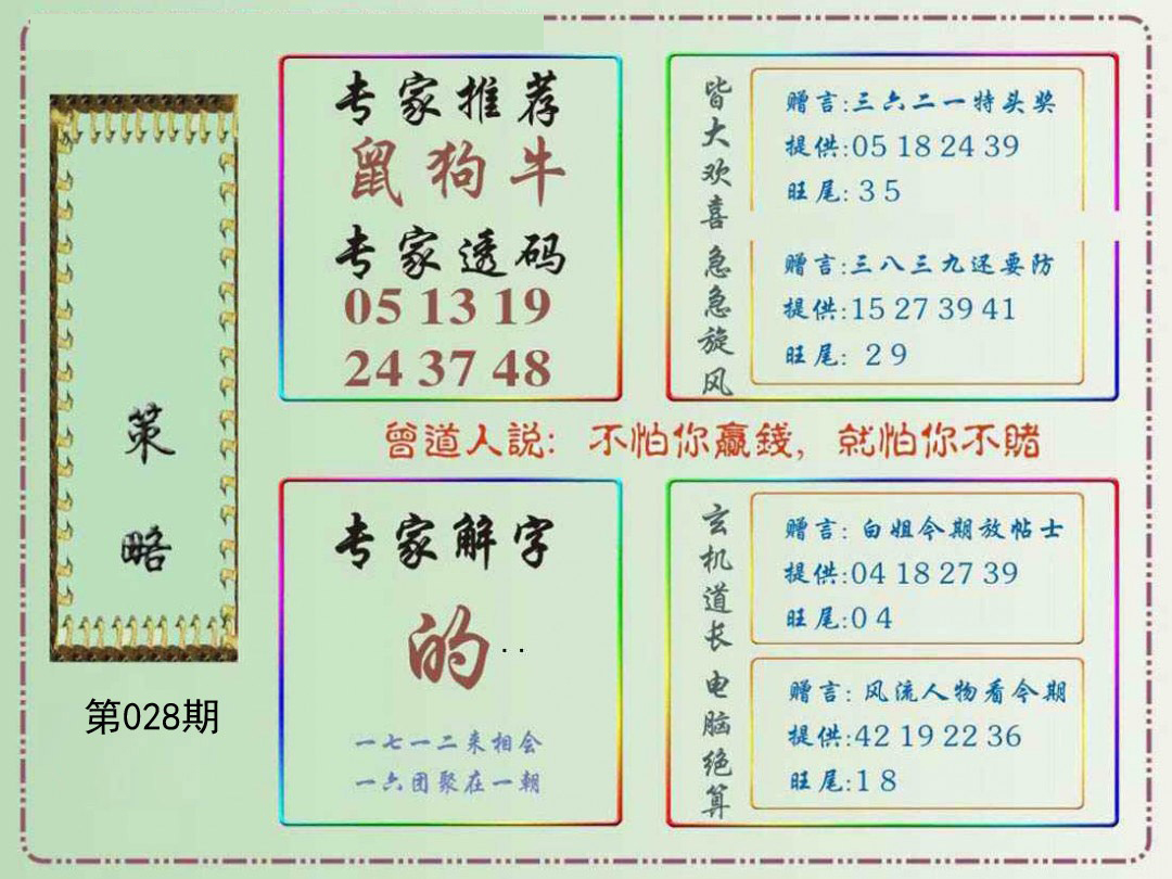 | 001期: ④肖 | 羊马鼠猪 | 狗32 |